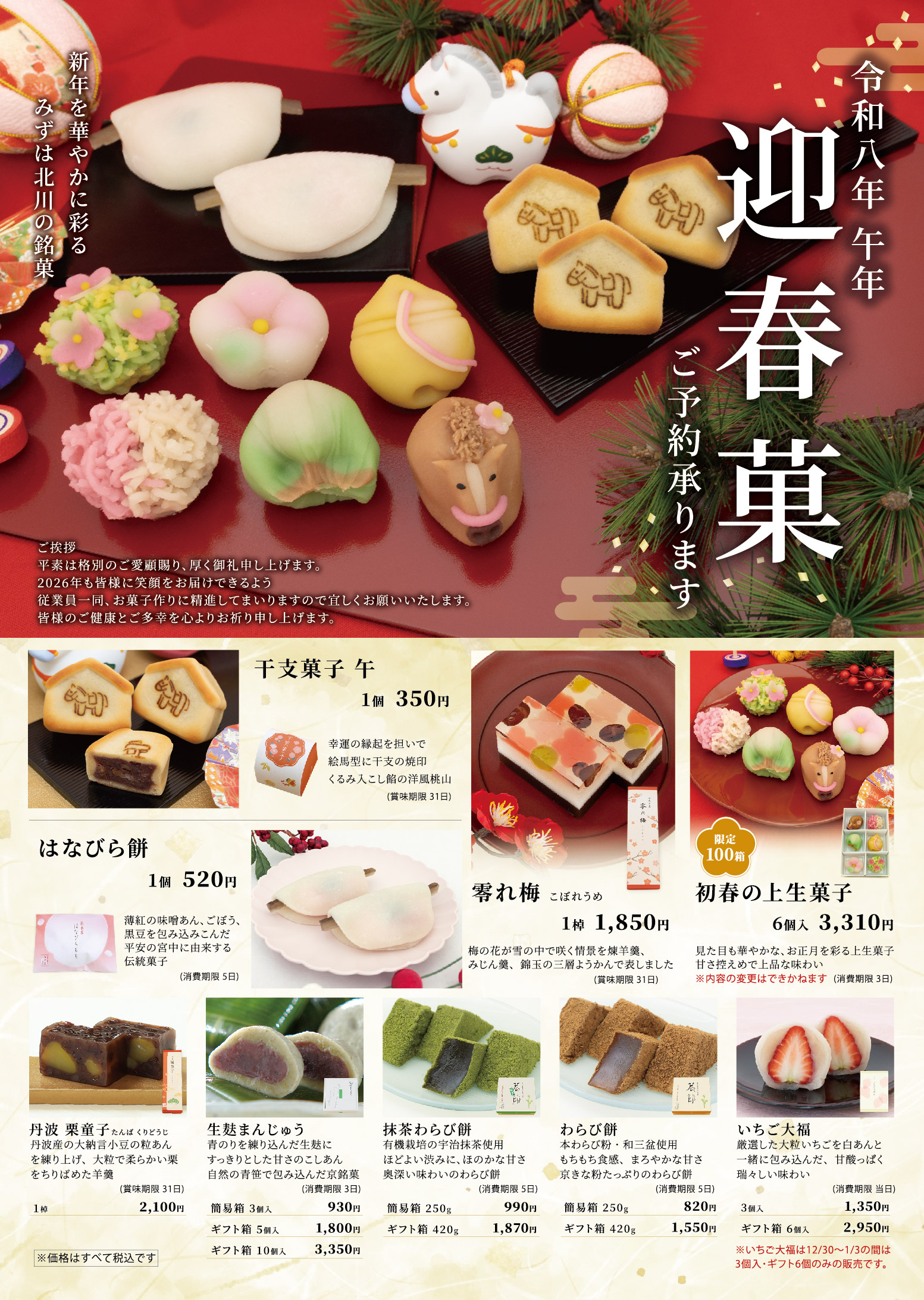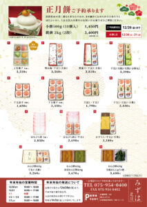 店頭にて、2026年(令和8年)迎春菓チラシを配布しております。