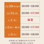 2019年12月17日 / 最終更新日時 : 2024年12月6日 takehara お知らせ 迎春チラシを配付しております。 迎春チラシPDF版はこちら 店頭で迎春菓チラシを配布しております。 お電話でのご予約も承っておりますので お気軽にお電話ください。 TEL 075-954-0400 【年内の営業時間】 12/30(月)まで 9:30 […]